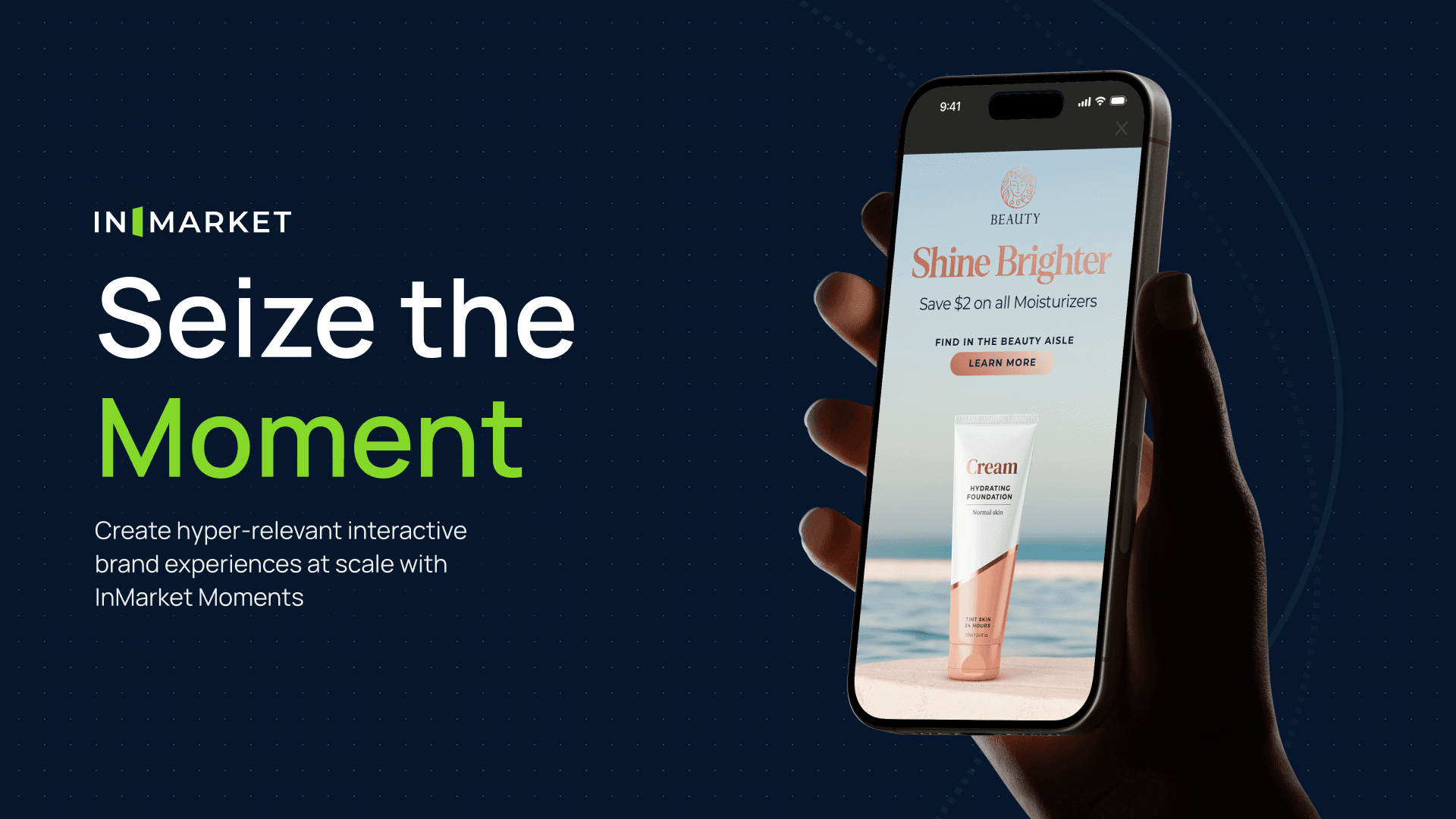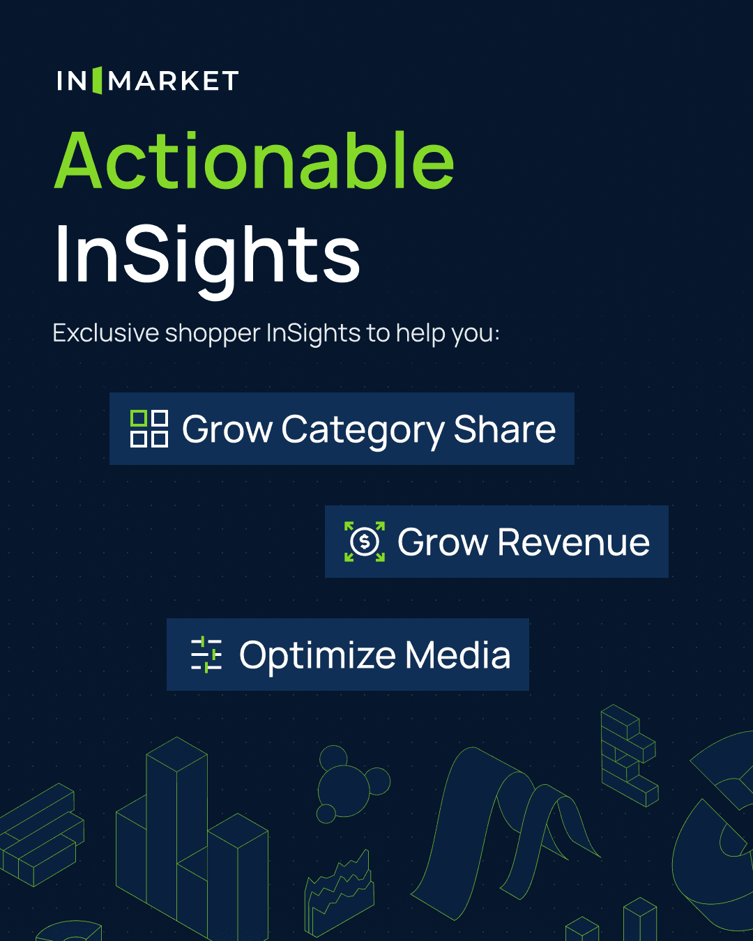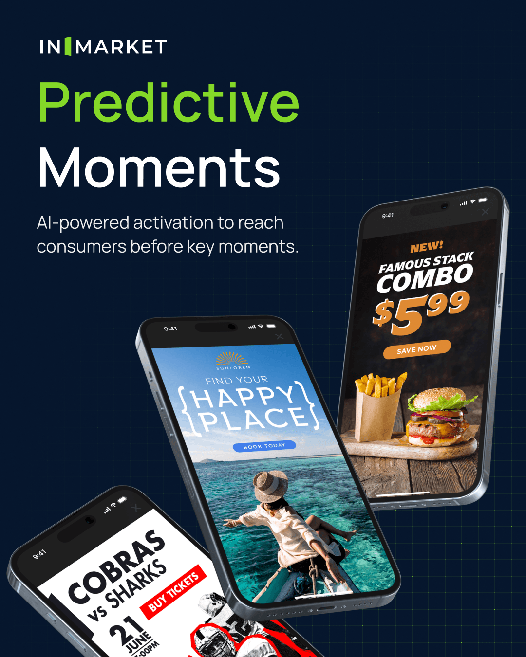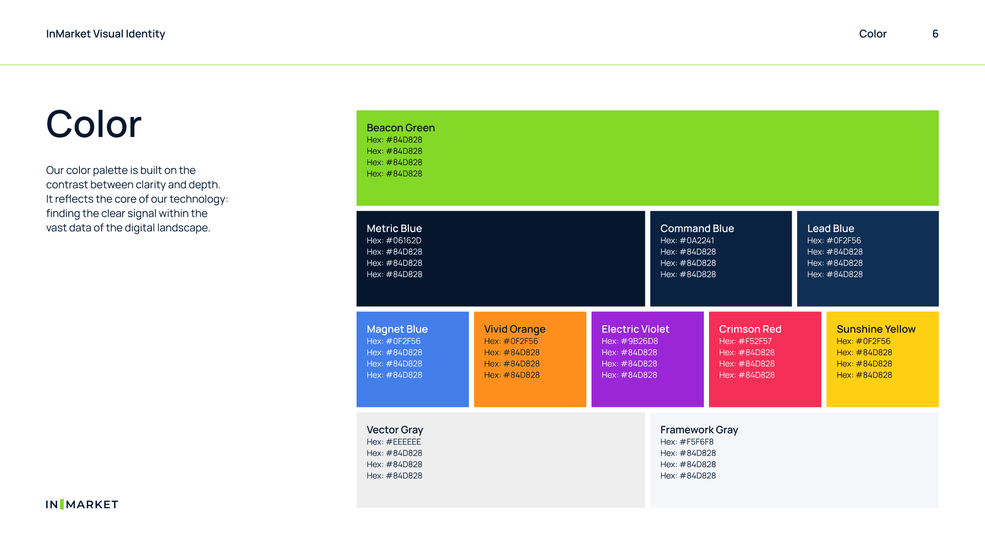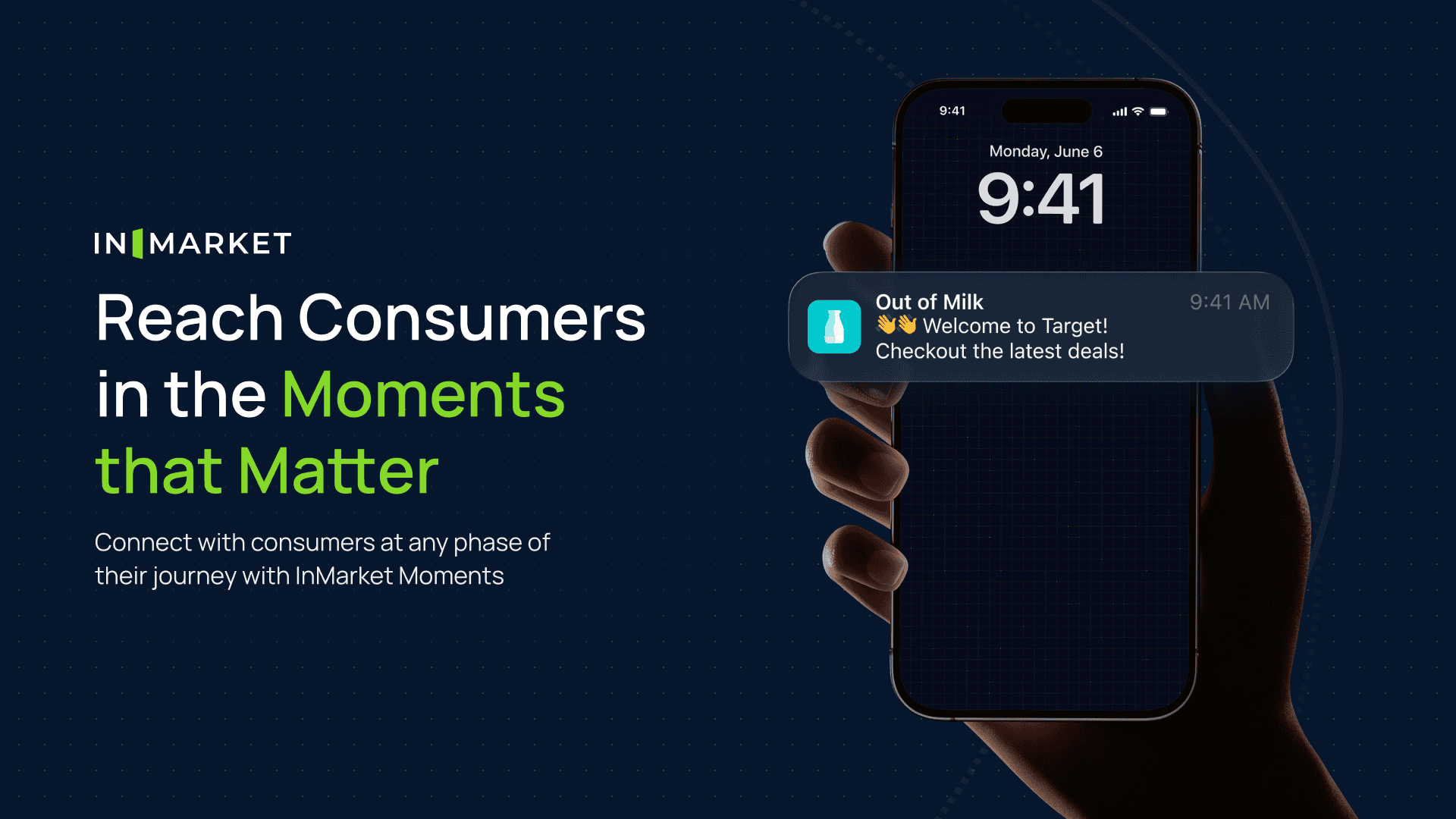 We wanted to convey that InMarket is an omnichannel advertising technology company that specializes in high performing campaigns. A majority of InMarket’s campaigns focus on delivering ads to consumers as they enter retailers. For the logo, we designed a door opening glyph that symbolizes a user entering a location. We leveraged navy blue and green for the color scheme to convey trust and growth, two important aspects of InMarket's core values.