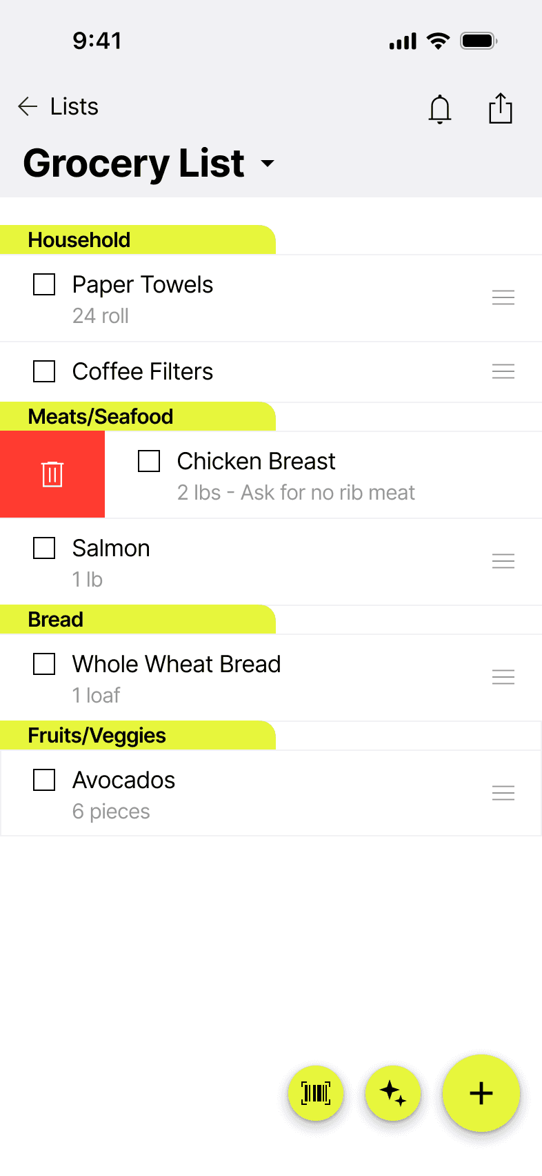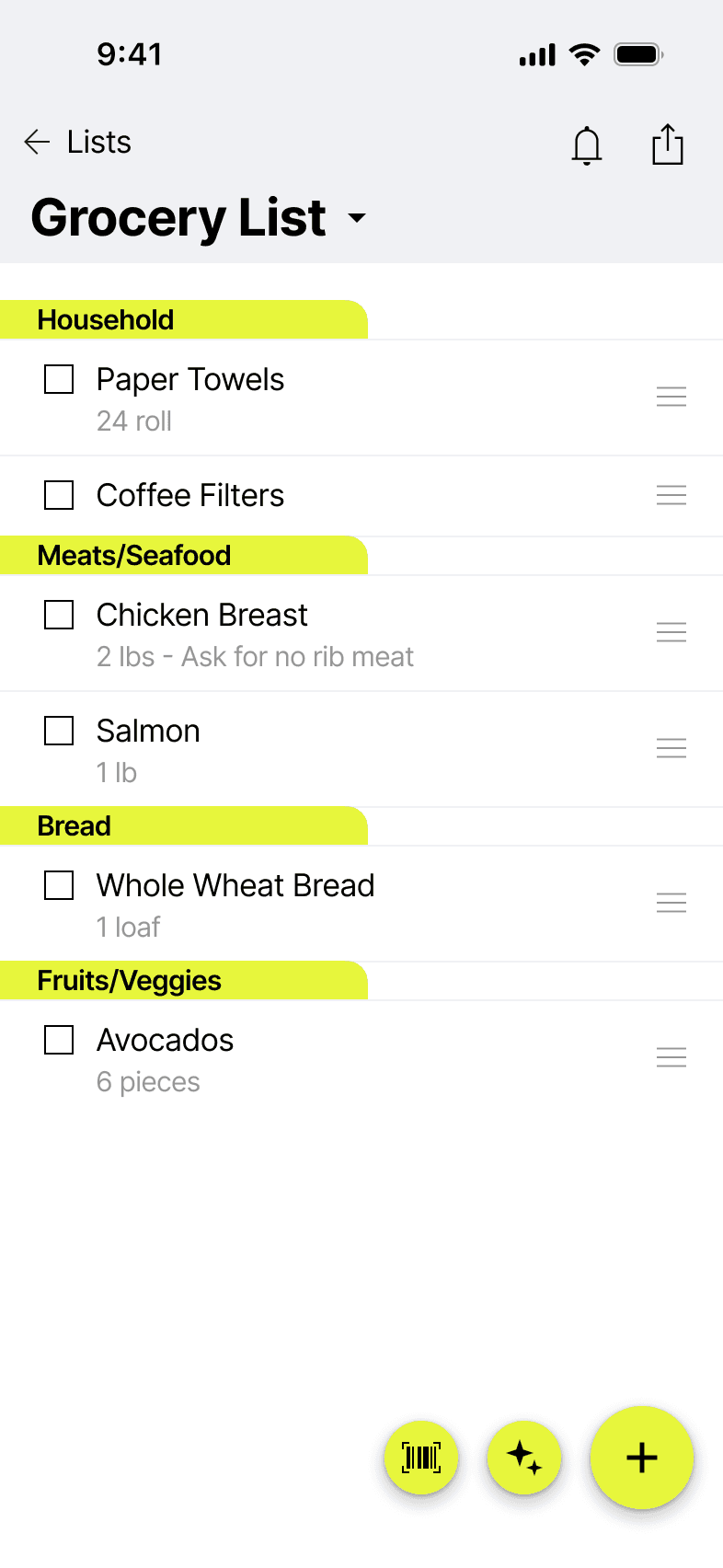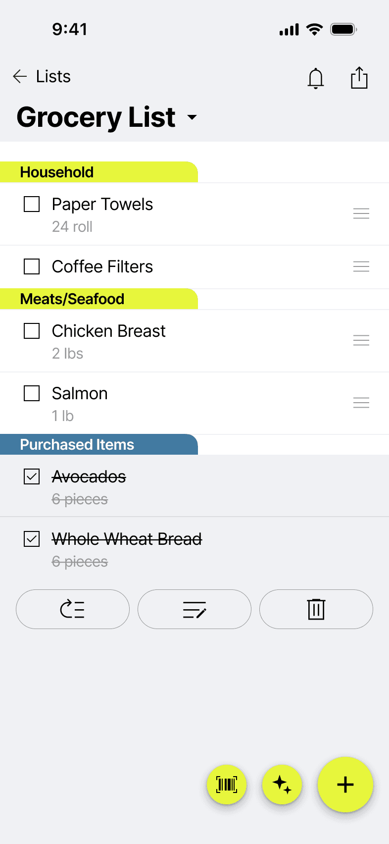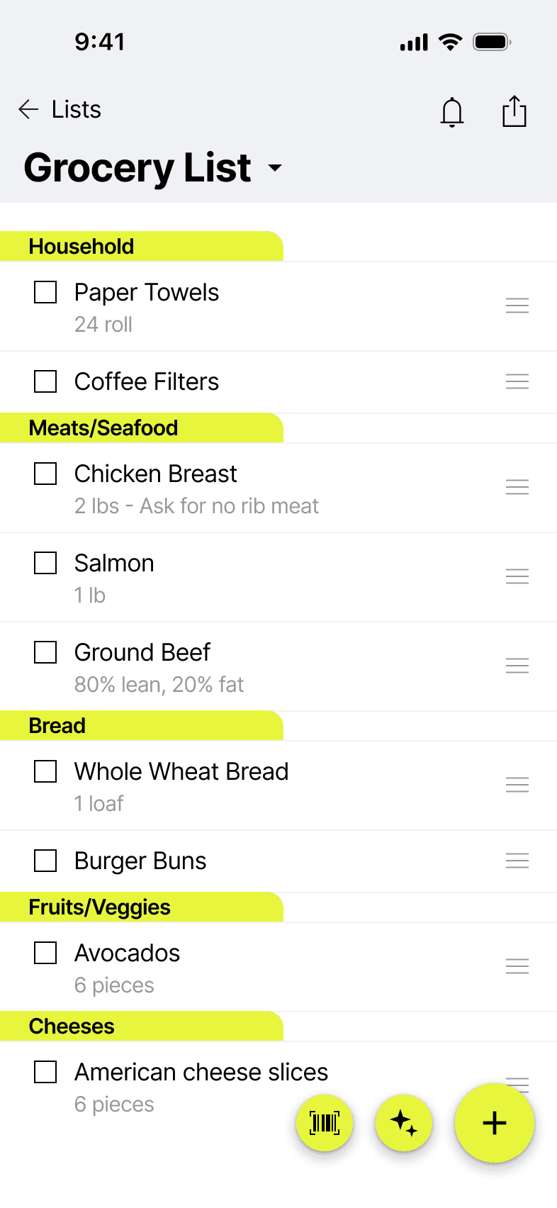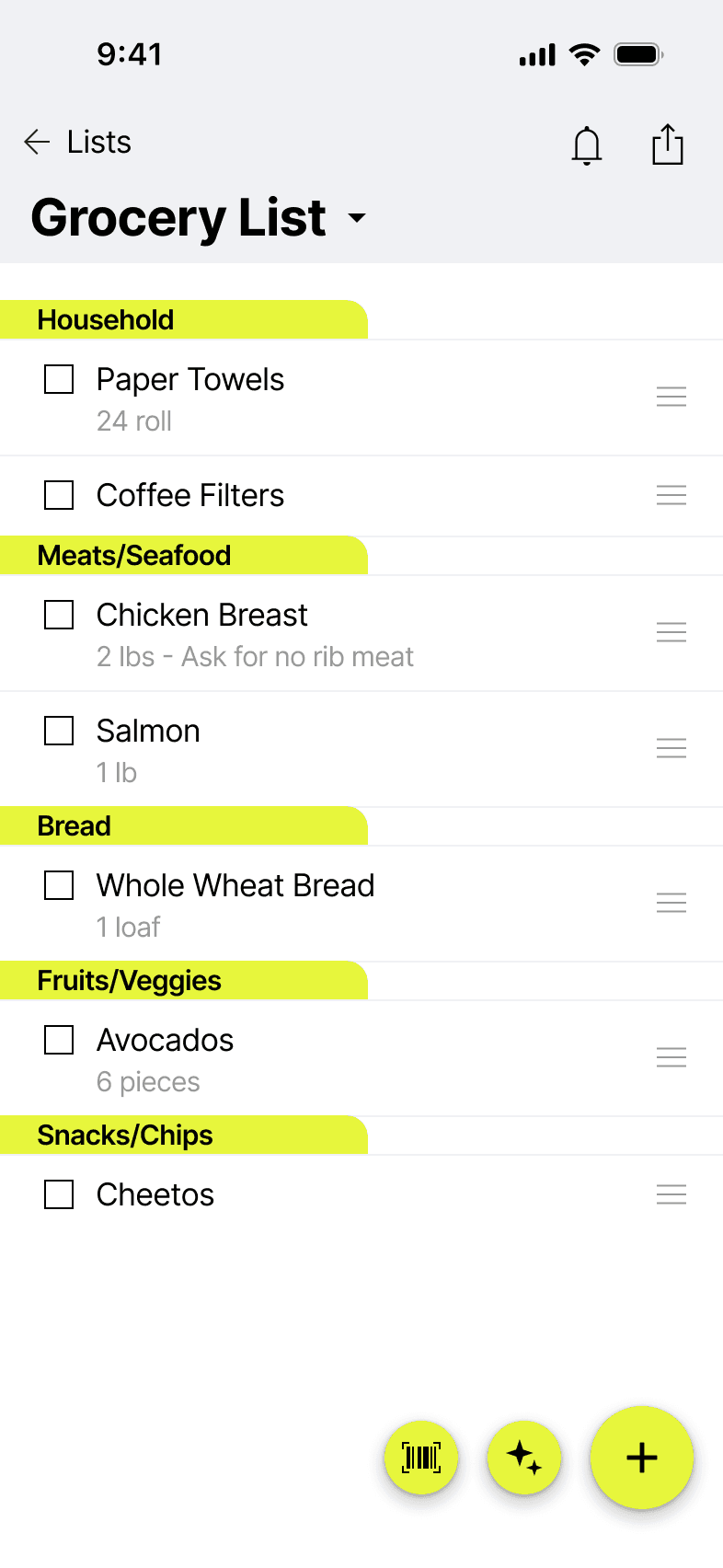 Magic Lists also offers unique features like automatic categorization by store aisle, smart unit suggestions based on item type, barcode scanning to quickly add items you already own, location-based reminders when you enter a specific retailer, and easy list sharing with family and friends.